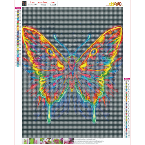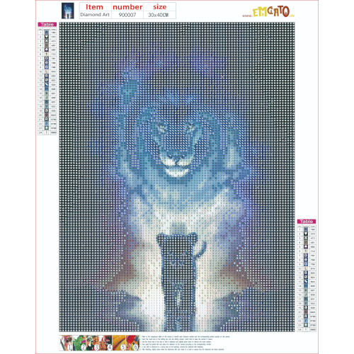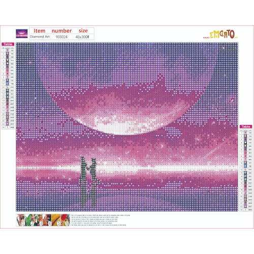 Die Leinwand ist mit einer selbstklebenden Schicht und einem vorgefertigten Muster bedruckt, das durch kleine, nummerierte Felder in verschiedene Farben unterteilt ist. Diese Felder geben genau vor, wo die passenden Diamanten platziert werden müssen – ähnlich wie bei Malen nach Zahlen oder Kreuzsticharbeiten, aber ohne Nadel oder Farbe. Jedes Farbfeld entspricht dabei einem bestimmten Diamanten, der mithilfe eines speziellen Applikationsstifts aufgenommen und präzise auf die Leinwand gesetzt wird.
