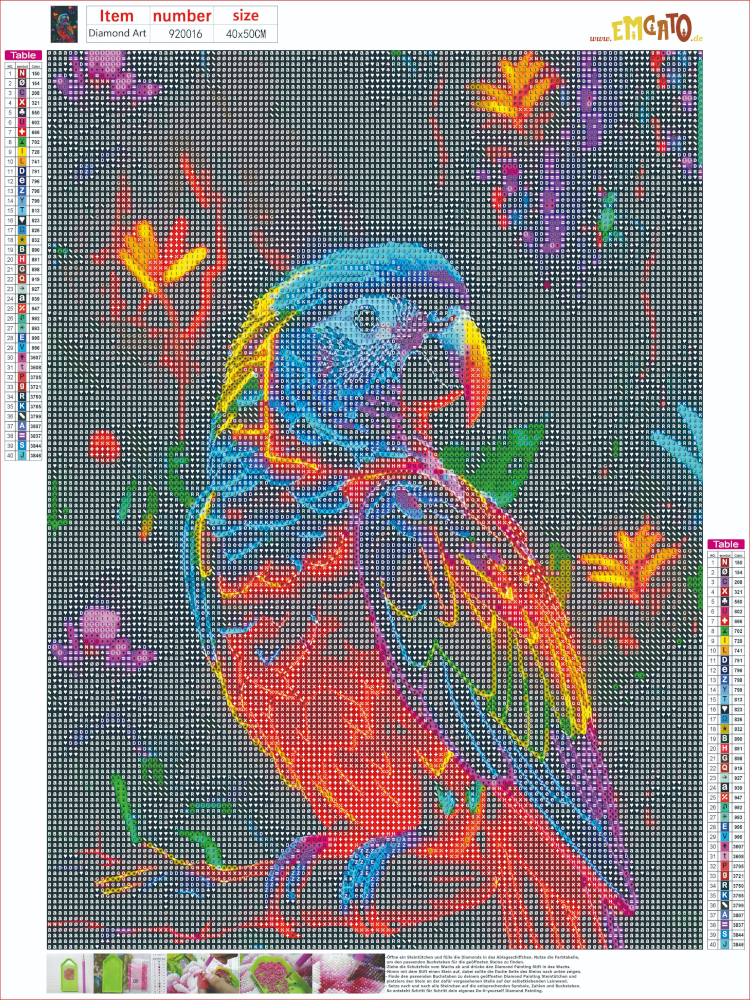 • Symbole und Farben: Die Leinwand ist mit Symbolen bedruckt, die den Farben der Diamanten entsprechen. Ähnlich wie bei Malen nach Zahlen platziert man die farbigen Steine auf den entsprechenden Symbolfeldern.