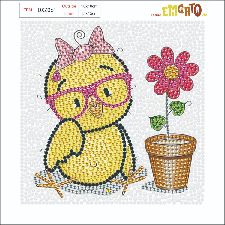 Das Bild zeigt ein niedliches gelbes Küken mit einer rosa gepunkteten Schleife auf dem Kopf und einer großen pinken Brille. Das Küken sitzt auf dem Boden und hebt einen seiner Flügel, als würde es grüßen oder nachdenklich schauen. Neben dem Küken steht ein kleiner Blumentopf mit einer rosa Blume, die ebenfalls weiße Punkte hat. Das Küken wirkt sehr verspielt und fröhlich.