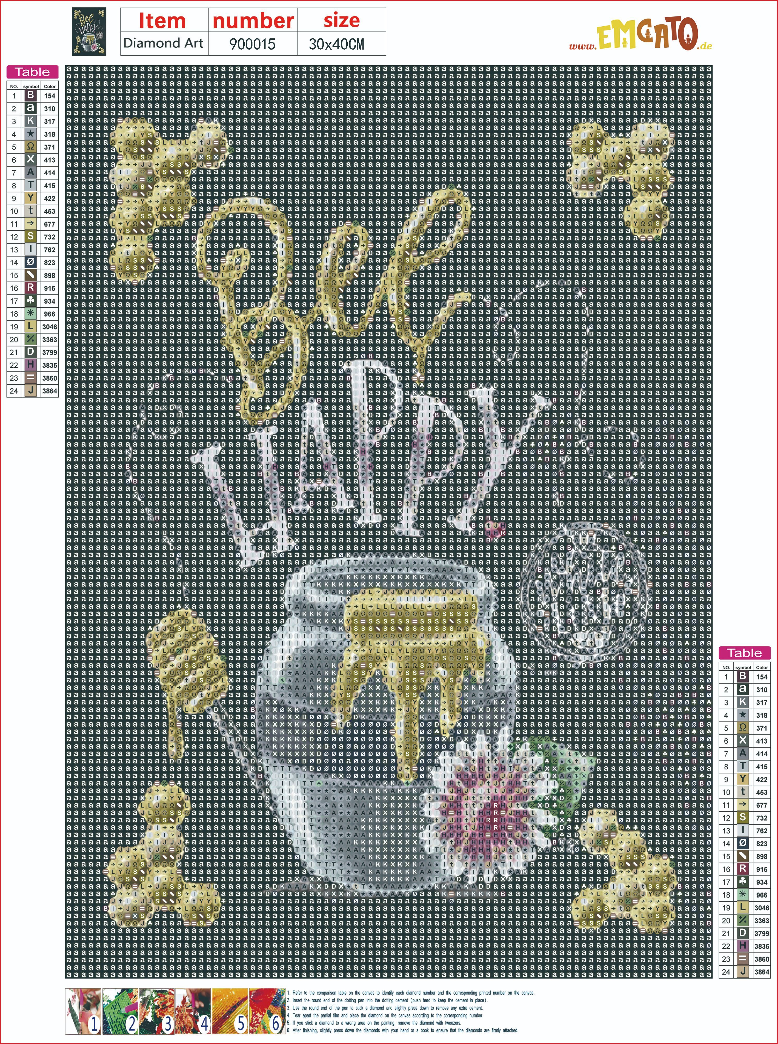 • Symbole und Farben: Die Leinwand ist mit Symbolen bedruckt, die den Farben der Diamanten entsprechen. Ähnlich wie bei Malen nach Zahlen platziert man die farbigen Steine auf den entsprechenden Symbolfeldern.