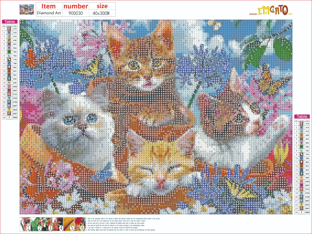 • Symbole und Farben: Die Leinwand ist mit Symbolen bedruckt, die den Farben der Diamanten entsprechen. Ähnlich wie bei Malen nach Zahlen platziert man die farbigen Steine auf den entsprechenden Symbolfeldern.