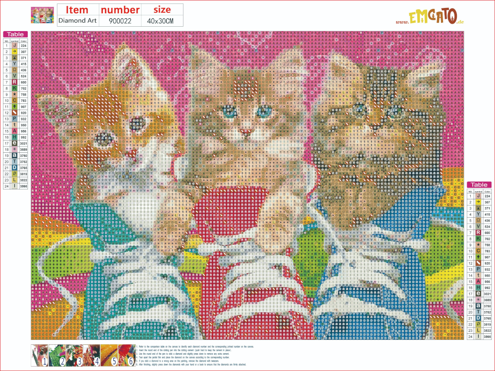 • Symbole und Farben: Die Leinwand ist mit Symbolen bedruckt, die den Farben der Diamanten entsprechen. Ähnlich wie bei Malen nach Zahlen platziert man die farbigen Steine auf den entsprechenden Symbolfeldern.