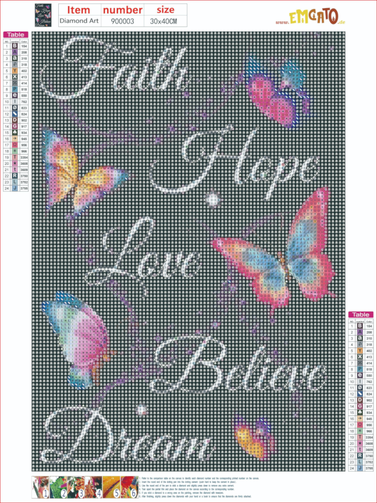 - Symbole und Farben: Die Leinwand ist mit Symbolen bedruckt, die den Farben der Diamanten entsprechen. Ähnlich wie bei Malen nach Zahlen platziert man die farbigen Steine auf den entsprechenden Symbolfeldern.