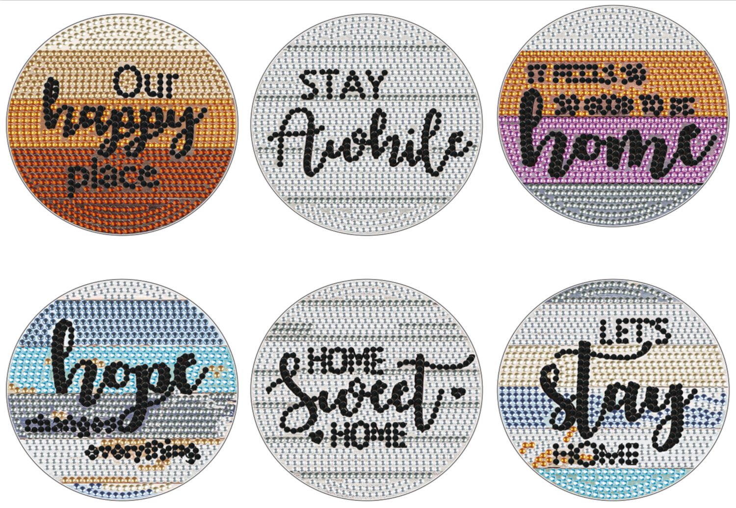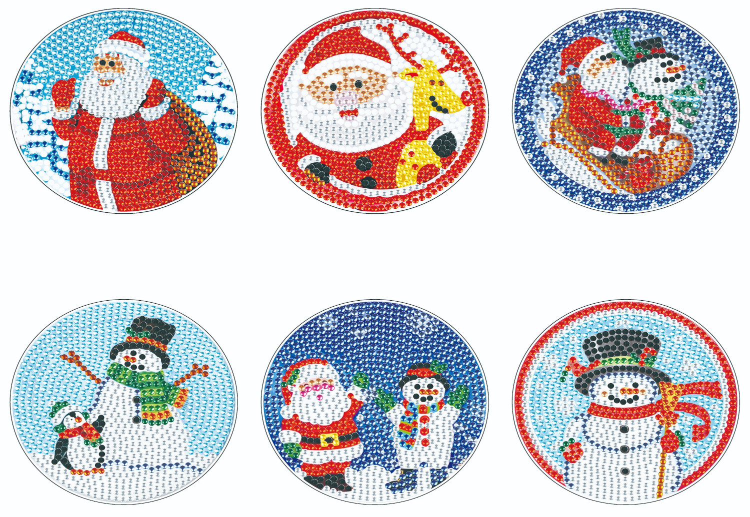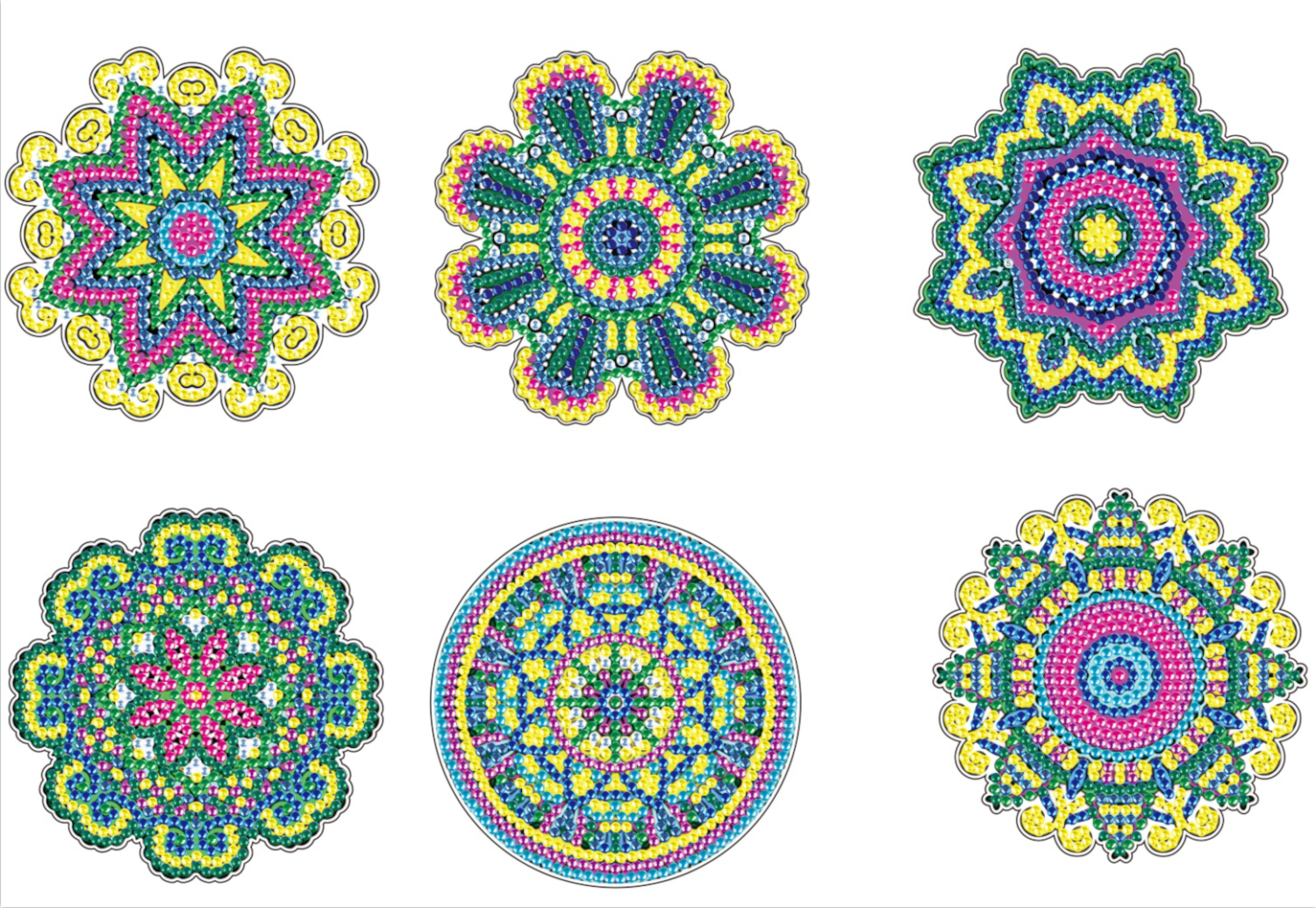 Das Bild zeigt eine Sammlung von sechs runden und sternförmigen Diamond Painting Untersetzern, die mit kühlen Farbtönen wie Blau, Grün und Lila gestaltet sind. Die Designs sind inspiriert von Schneeflocken und abstrakten winterlichen Mustern, die einen eleganten und festlichen Eindruck vermitteln. Die glitzernden Steinchen verleihen den Untersetzern einen besonderen Schimmer, der die filigranen Details der Muster hervorhebt. Diese Untersetzer verbinden dekorative Ästhetik mit praktischer Funktion und eignen sich perfekt für winterliche Tischdekorationen oder als Geschenk zur Weihnachtszeit.